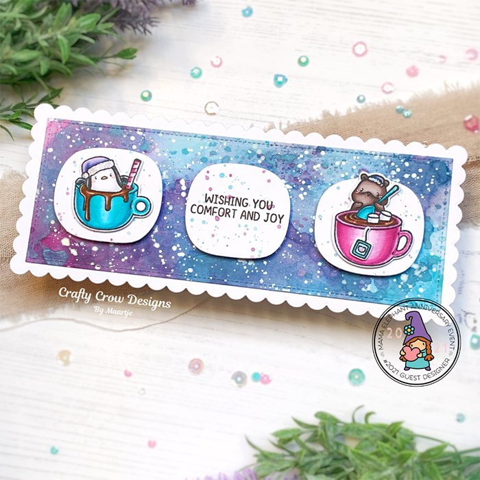 Hi crafty friends! Maartje here from Crafty Crow Designs I was very lucky to receive the oh-so-adorable Hot Cocoa stamp set. I colored the cute critters with my Copic markers, do you have a favorite? For the background I used the Distress Ink smooshing technique with colors that match nicely with the critters. To create the slimline design, I used the Slim Card Basics die, which really has become a staple in my craftroom! On my YouTube channel you can watch the video tutorial of this slimline holiday card.