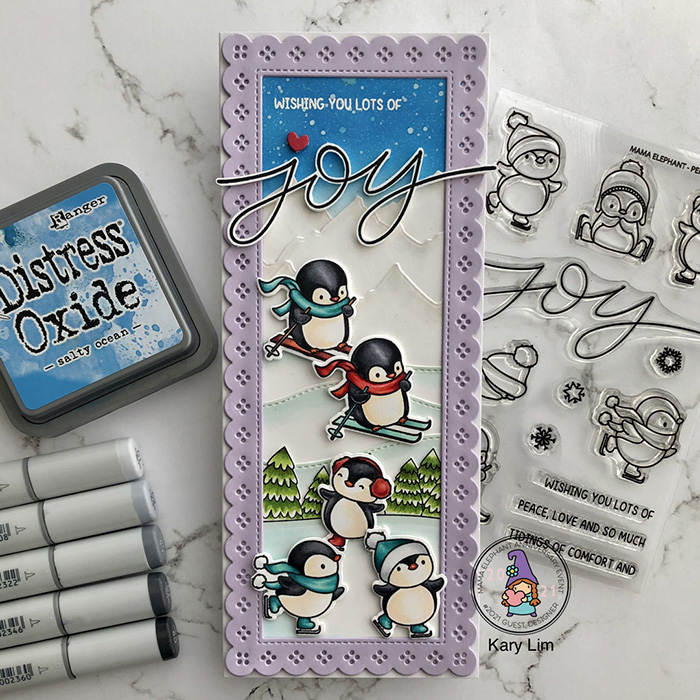 For my card, I had this fun winter scene in mind. I stamped and colored the penguins with copic markers and die-cut them using the coordinating dies. To create the scene, there are 4 parts to it. On a slimline sized cardstock (Neenah solar white paper cut to size 2 3/4"x 73/4"), I did some ink blending with Distress Oxide Salty Ocean - just a small section at the top of the paper. I then spritzed some fine mist of water on it, dried it and followed by a spritz of sparkle shimmer. To finish off the skies section, I added some white droplets by tapping a fine brush with white watercolour paint.