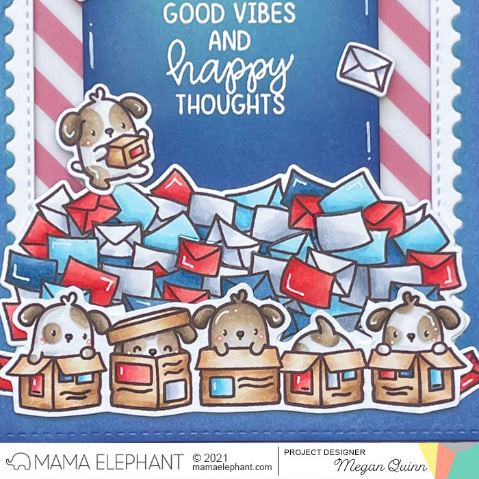 For my card today, I chose the pups playing in parcels all lined up. I thought that it would be so much fun to make a mail themed design with the coordinating United States Postal Service color scheme. I just love how it turned out!