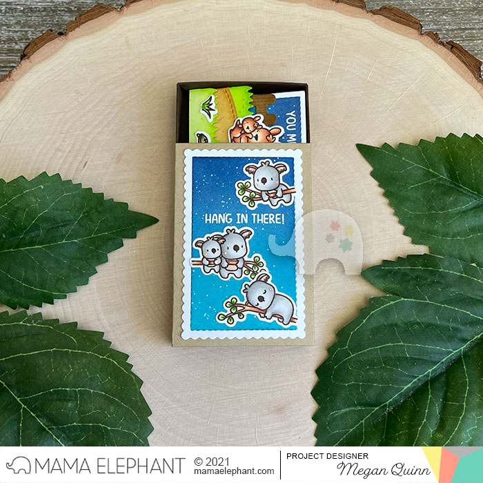 On the first design, I envisioned a night time scene from down under. I used Tumbled Glass, Peacock Feathers, Blueprint Sketch, and Chipped Sapphire Distress Inks to blend the sky on both rectangles. I then splattered on Copic White to look like stars before removing the Post It Tape. After giving the panels ample time to dry, I heat embossed sentiments from Koala Hugs in white to make them pop off the background.