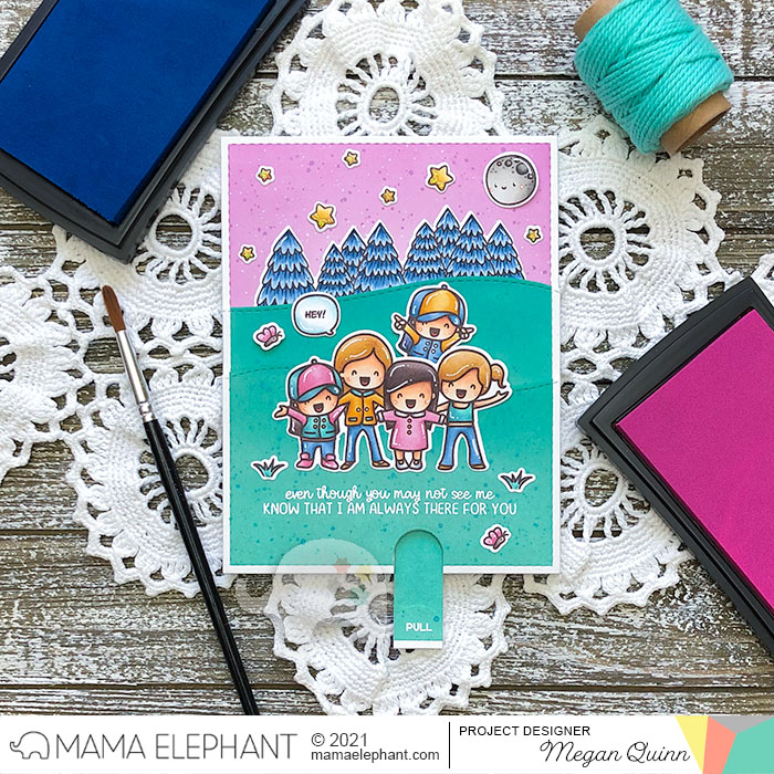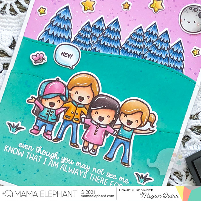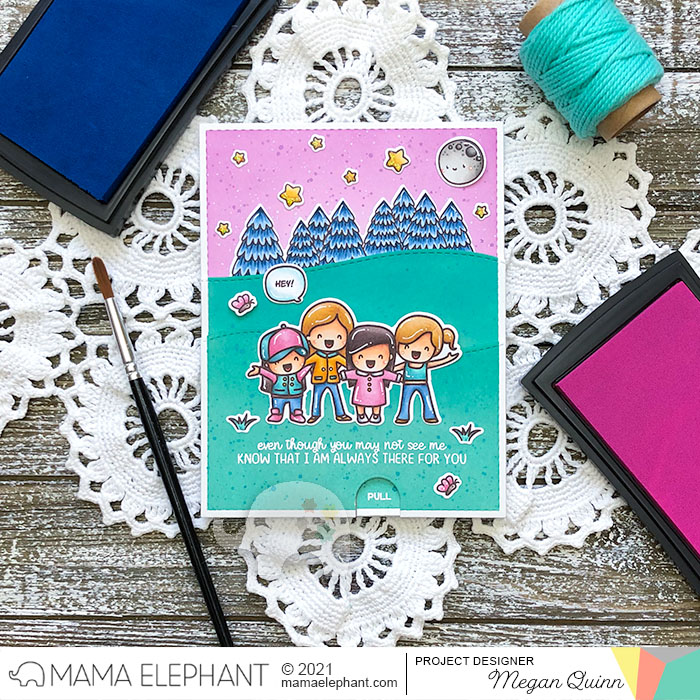 As a fun surprise, I used a double loop slider mechanism to make the card interactive. I used the Slider Glider CC for the pull tab. When you pull the tab at the bottom, one of the friends pop up from behind the group. I think that this effect is the perfect match for the sentiment that says "even though you may not see me, know that I am always there for you".