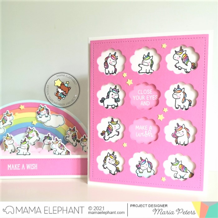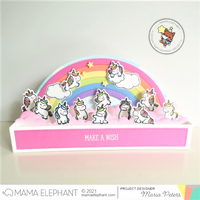 Maria created two magical projects using the Little Unicorn Agenda Stamp Set and Creative Cuts. She paired these cuties with the Slim Scenescape Builder Creative Cuts, the Slim Scenescape Rainbow Add and some clouds from the Wish Upon A Star Stamp Set. A girls dream!