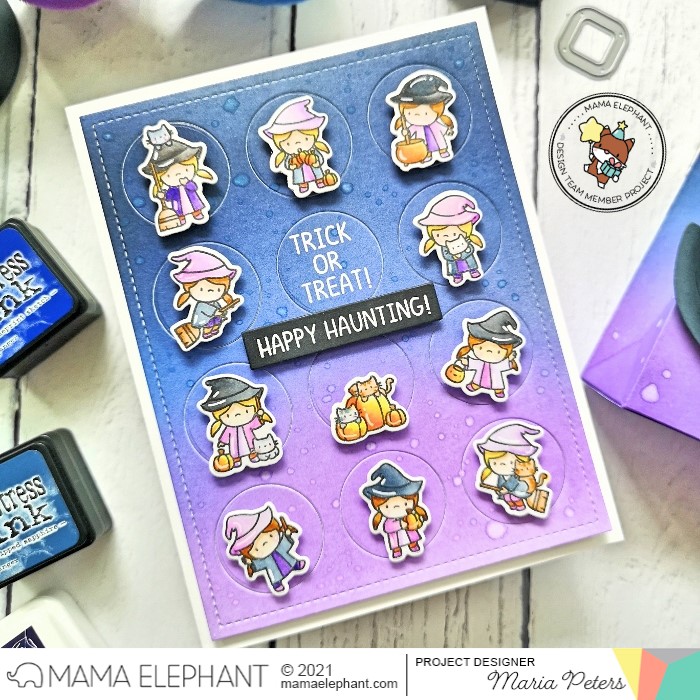 Maria has created a super cute card with the Little Witch Agenda Stamp Set. The dramatic ink blended background sets the little witches brilliantly in scene. She has combined the set with the Circular Grid Creative Cuts and Sentiments from the Happy Haunting Set. In addition, Maria created a little Bag with the Favor Bag Creative Cuts, the new Favor Bag Accessory Witch and the Little Witch Agenda Stamp Set. It took a lot of masking and ink blending, but it was worth the effort. We are thrilled!