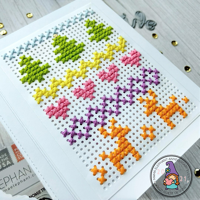 Our Guest Designer Jen from cre8iveli cross-stitched a beautiful background in sweet colors to match the tree from Oh Gnomie Tree stamp set!