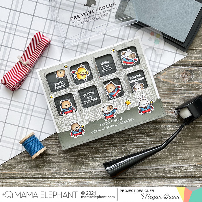 We love the way that Megan used Urban City to create this superhero design! The subtle stamping and ink blending provide the perfect backdrop for these caped crusaders from Little Superhero Agenda.