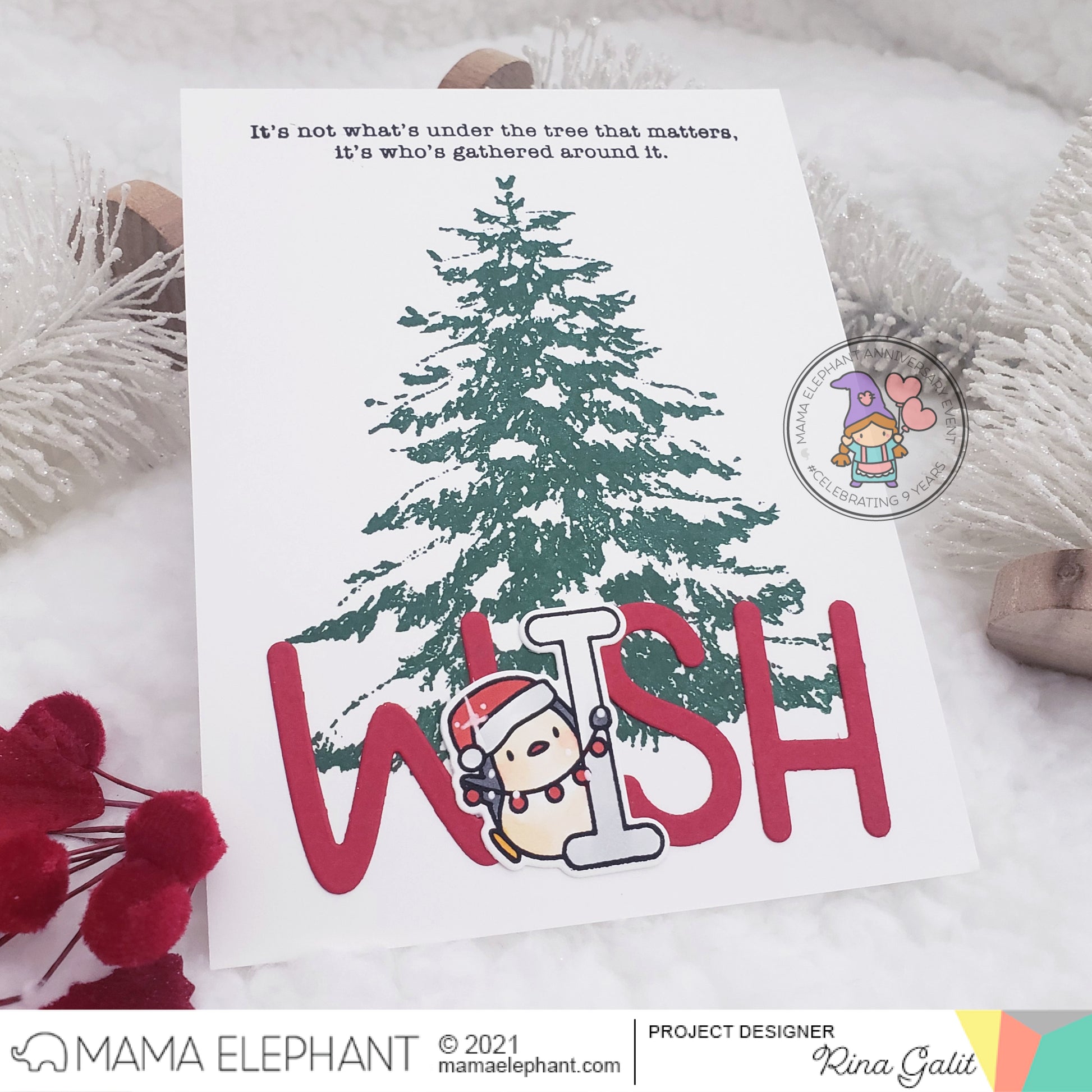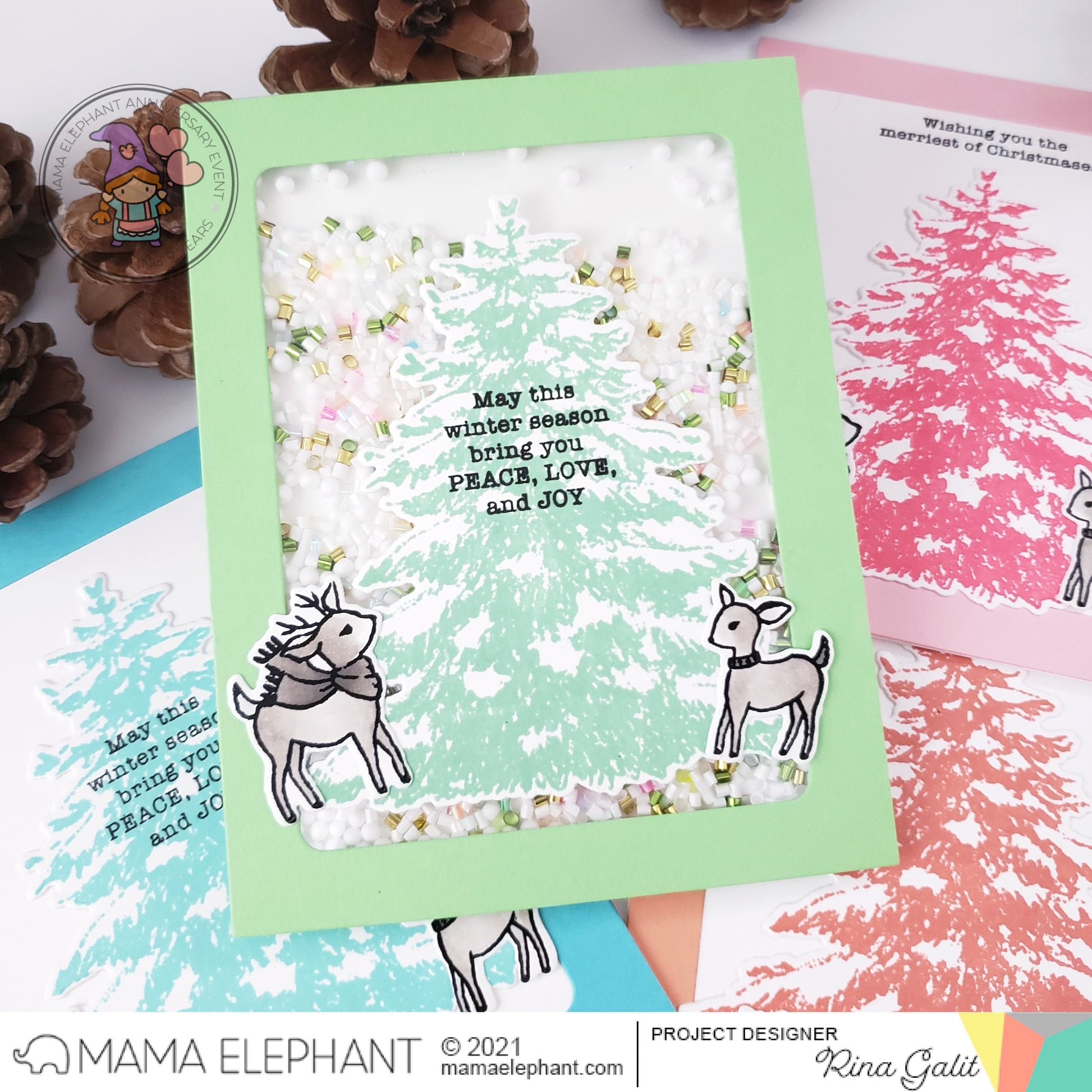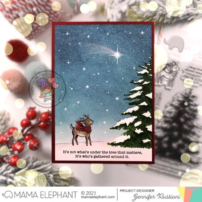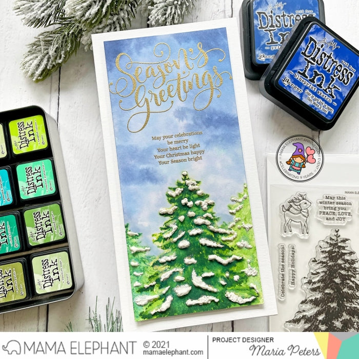 Snowy Tree stamp set is illustrated by Kryssi. Stamped singularly on its own, this magnificent tree in the forest covered with glistening snow depicts the wondrous beauty of the holiday season!
