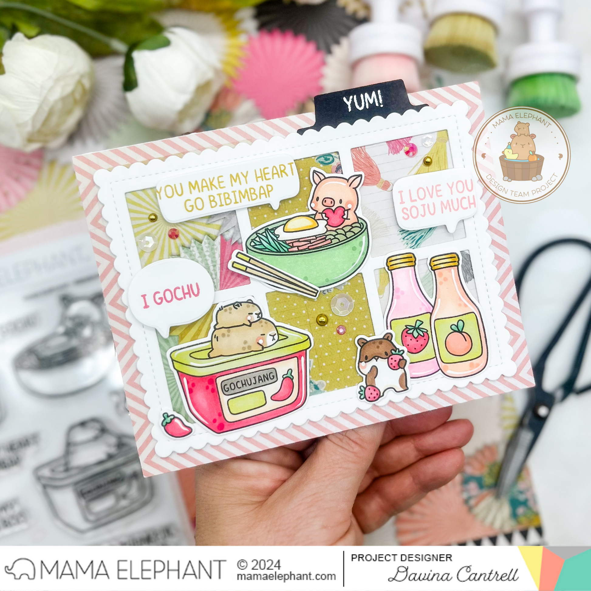 Bibimbap clear stamp set features Mama Elephant friends and some iconic Korean dishes like bibimbap, soondubu, and more. This set offers a touch of Asian flavor to your creative projects.
