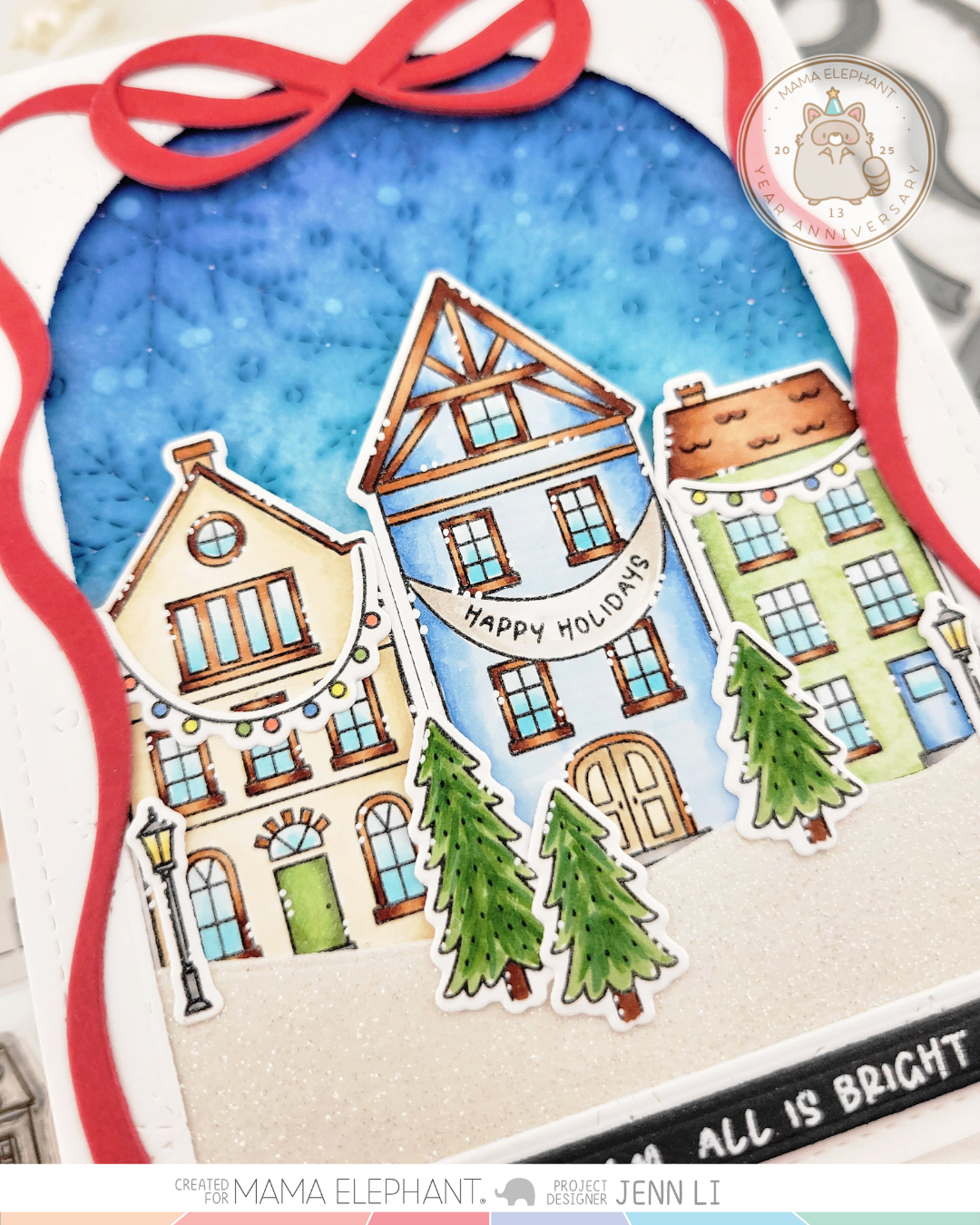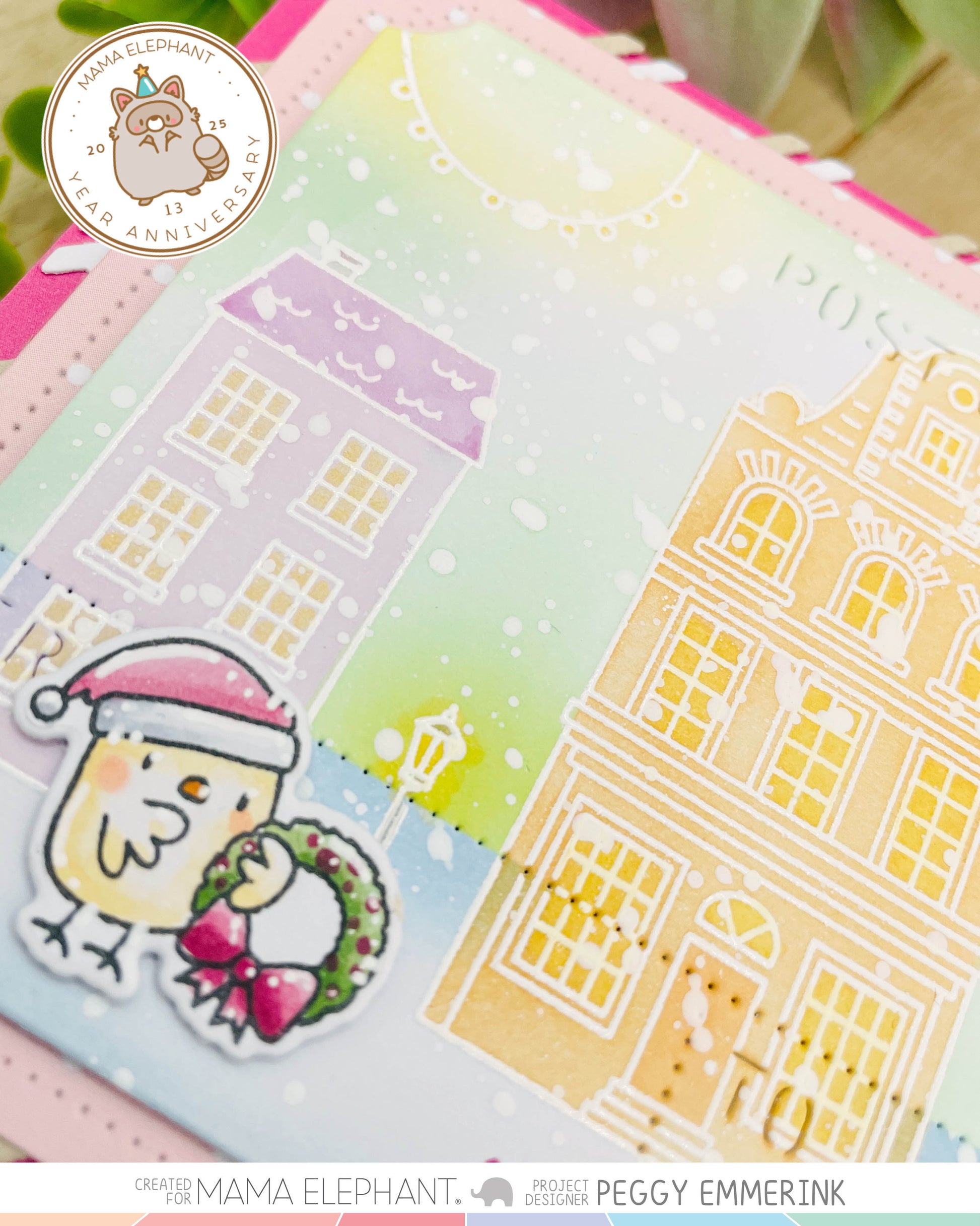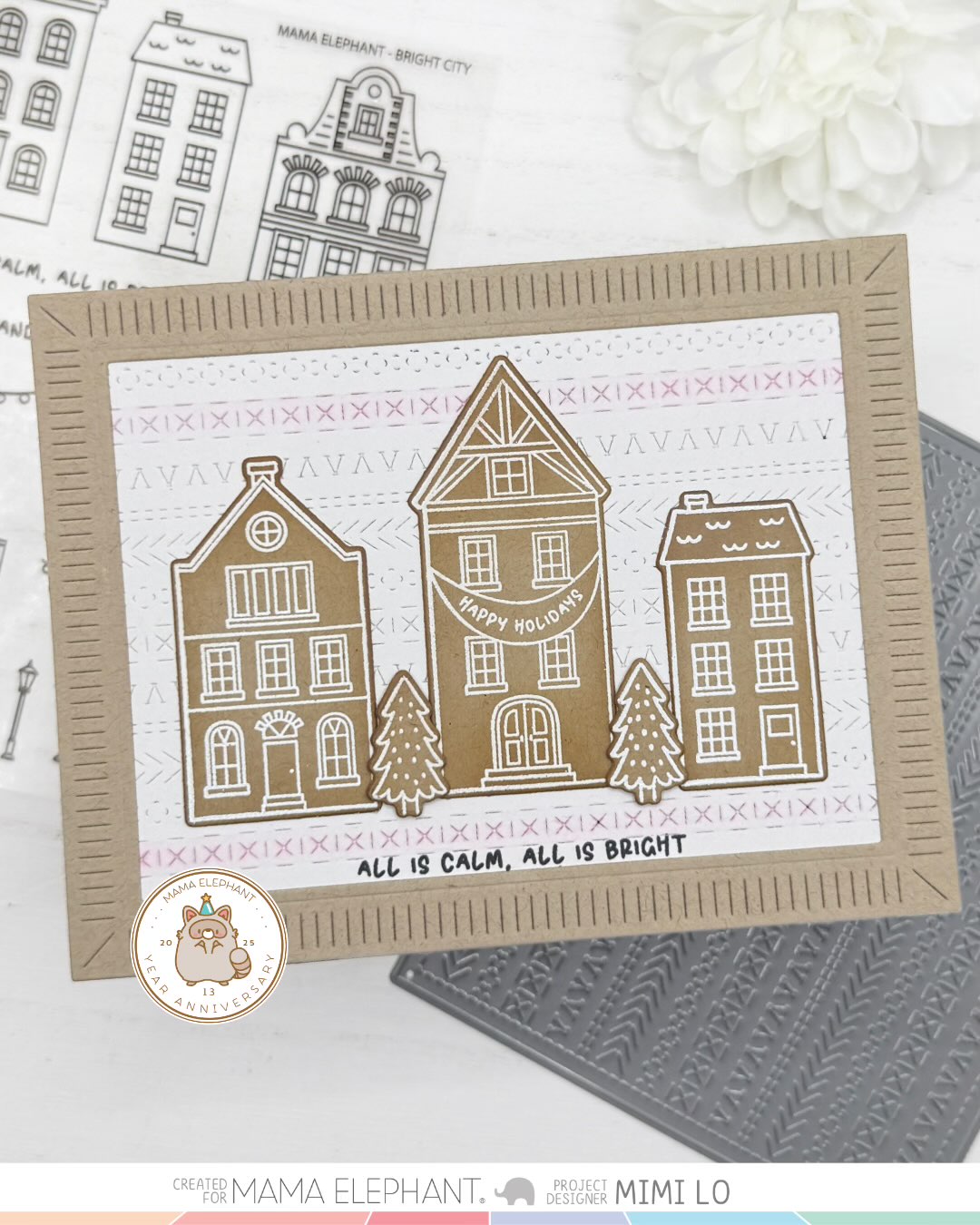 Bright City clear stamp set features a whimsical village filled with charming buildings, perfect for creating cozy holiday scenes. To add an extra festive touch, the set includes strung lights that can be stamped between the buildings, bringing your village to life with warmth and cheer. Whether used on their own or combined into a bustling street scene, these playful illustrations are a delightful way to capture the magic of the holiday season in your handmade projects.