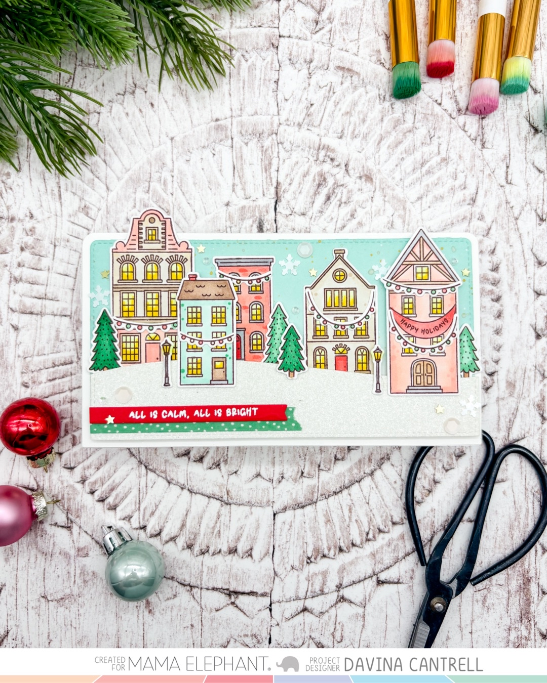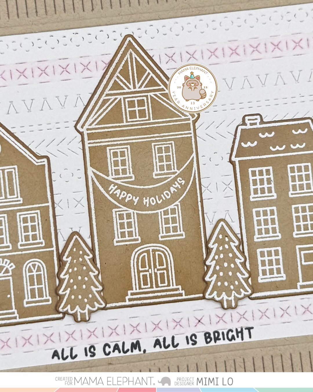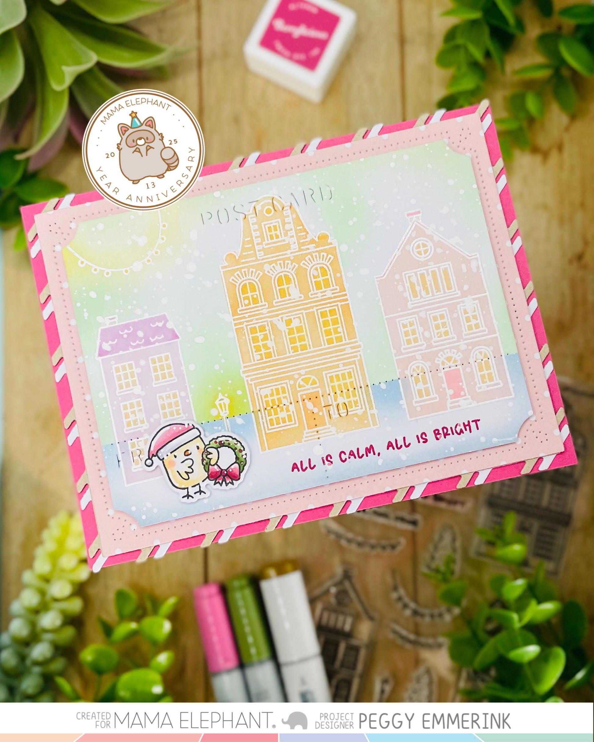 Bright City clear stamp set features a whimsical village filled with charming buildings, perfect for creating cozy holiday scenes. To add an extra festive touch, the set includes strung lights that can be stamped between the buildings, bringing your village to life with warmth and cheer. Whether used on their own or combined into a bustling street scene, these playful illustrations are a delightful way to capture the magic of the holiday season in your handmade projects.