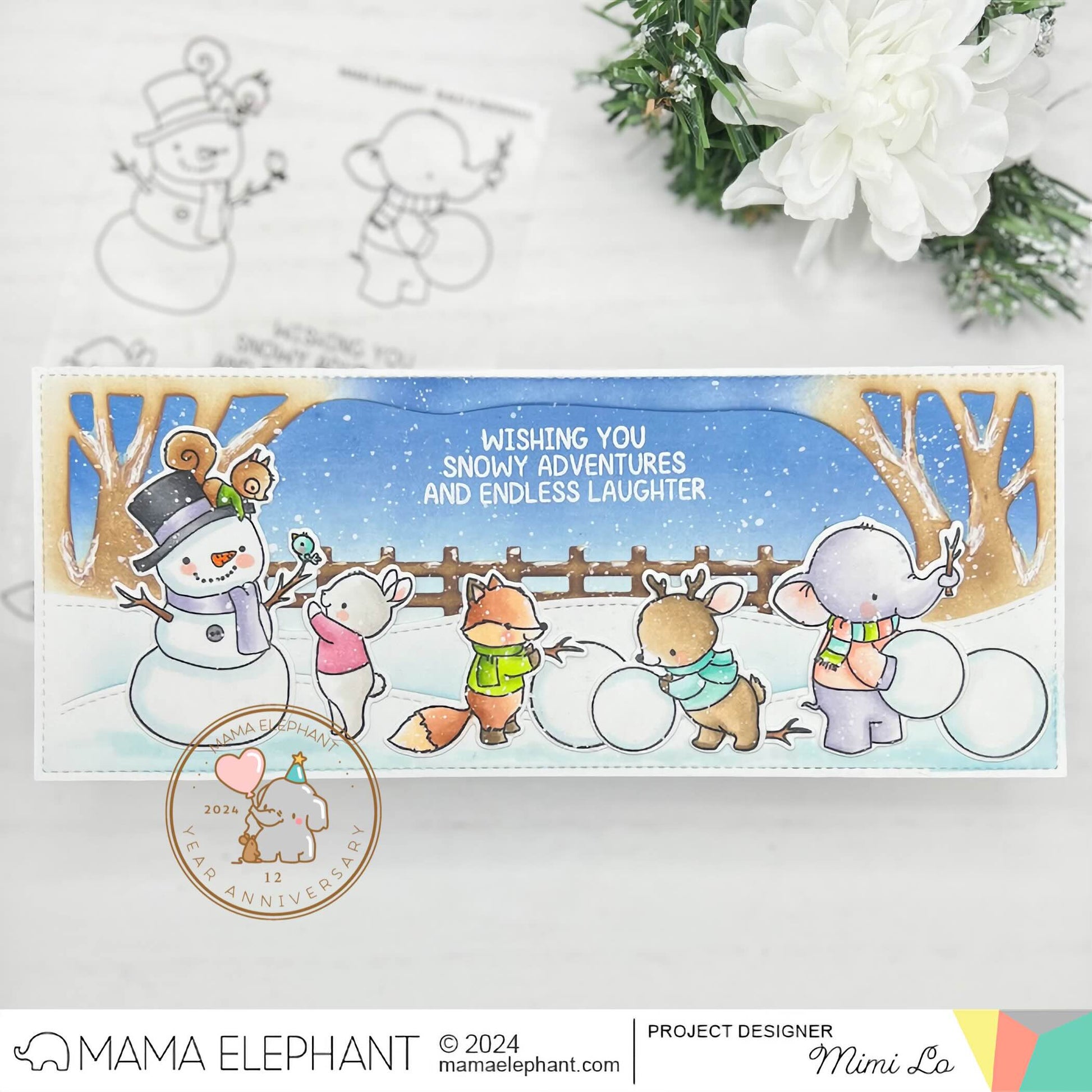 Build a Snowman clear stamp set is illustrated by Aida Zamora. This set captures the charm of winter fun with her adorable hand-drawn illustrations. It features cute animals, including a bunny, a fox, a reindeer and an elephant, joyfully building snowmen together. Each stamp showcases the animals in various playful poses, from rolling snowballs to decorating their frosty creations. The whimsical details and expressions bring warmth and cheer to any winter-themed project.