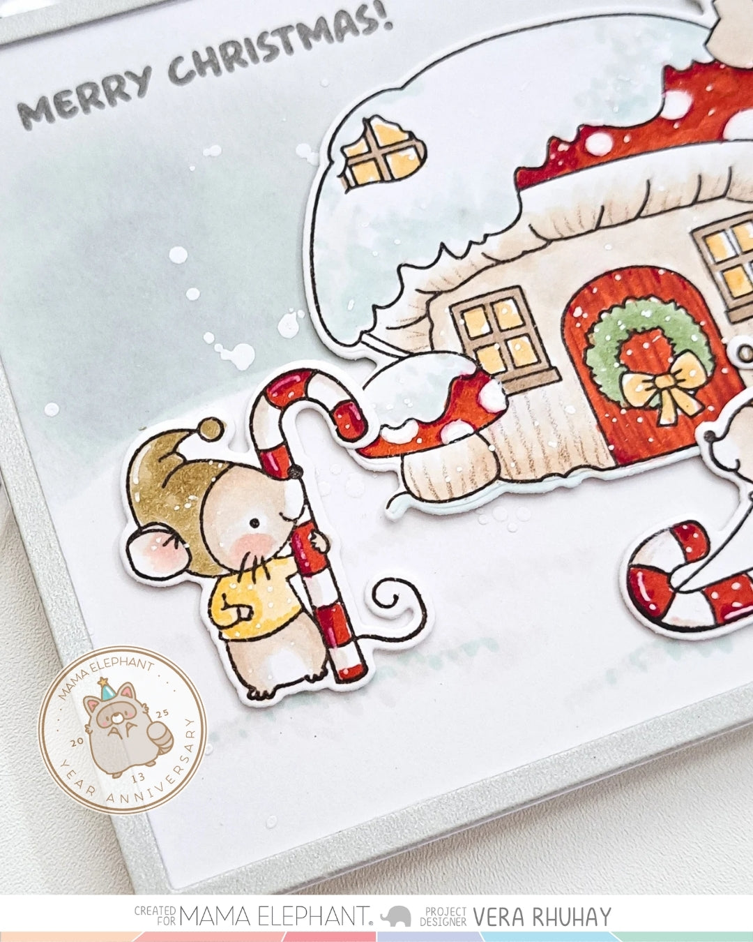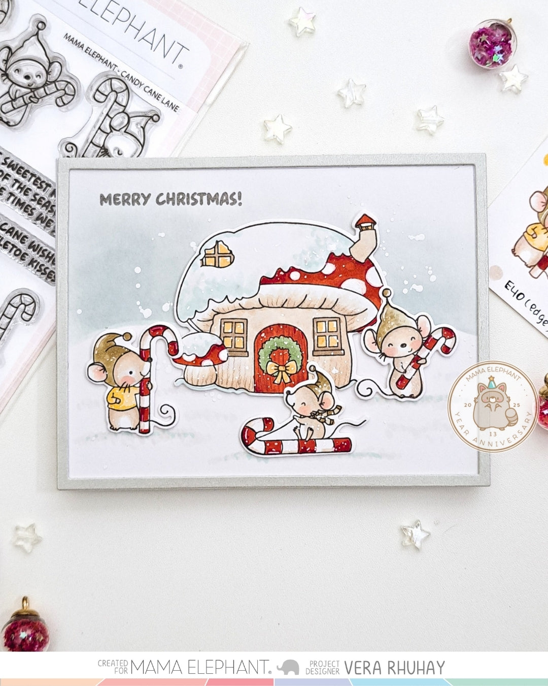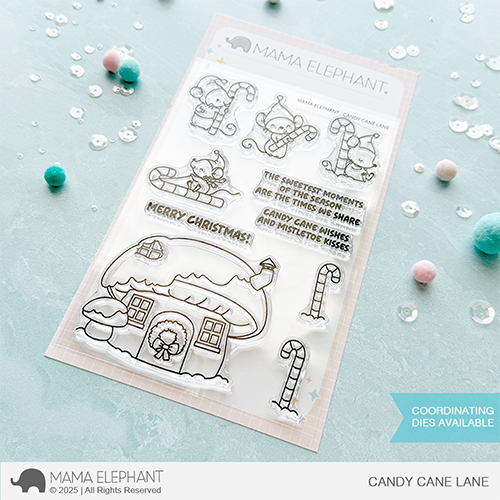 Candy Cane Lane clear stamp set is illustrated by Aida Zamora, featuring her beloved mouse friends in the most festive holiday scenes. The adorable mice can be found holding, sledding, and even snoozing against a giant candy cane, bringing plenty of holiday cheer. To complete their magical world, the set also includes a charming snow-capped mushroom house, perfect for creating cozy winter scenes.