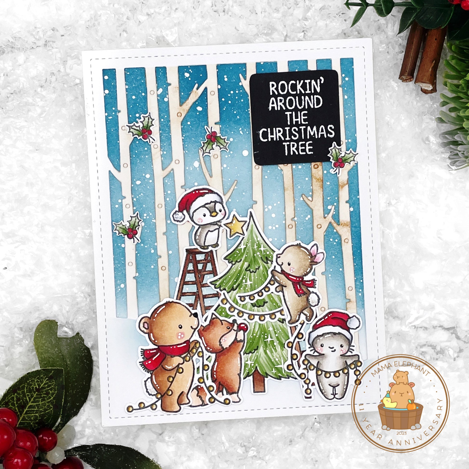 "Decorate The Tree" clear stamp set is illustrated by Aida Zamora. Each stamp in this collection showcases Aida's whimsical, storybook-like illustrations of winter animals joyfully adorning a festive tree. Transport yourself to a magical world where a fox, rabbits and a penguin come together to create heartwarming holiday scene.