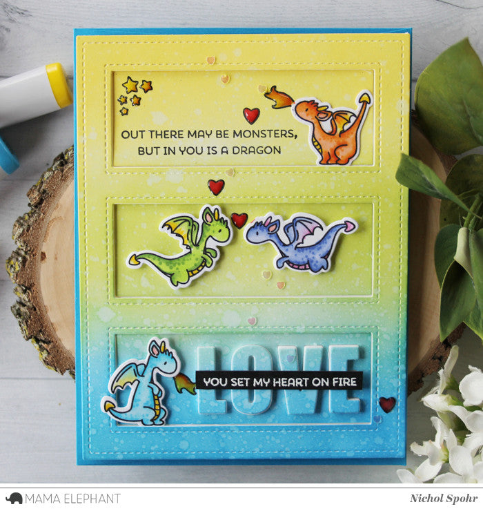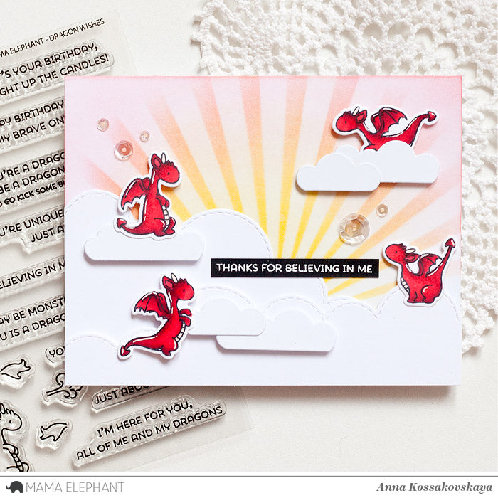 The mini dragons and the sentiments in the Dragon Wishes clear stamp set were designed to go with the "Me and My Dragon" set. Pair the dragons up with an encouraging sentiment and make your projects magical!