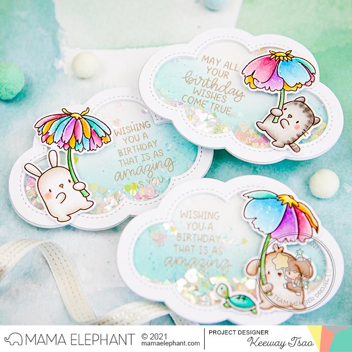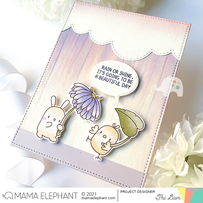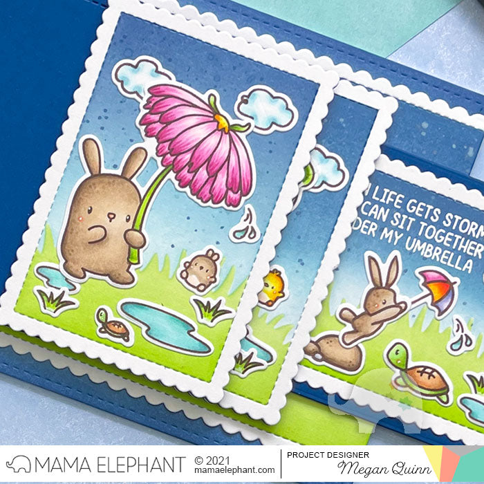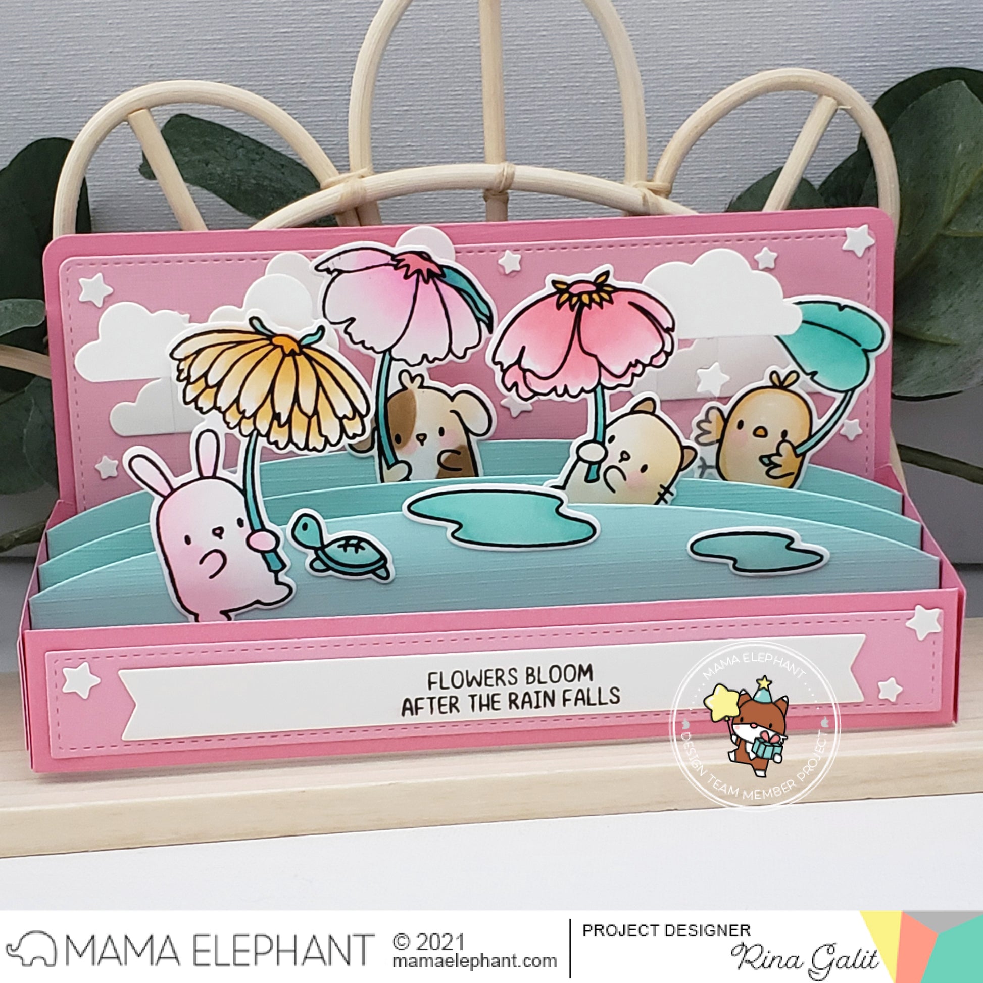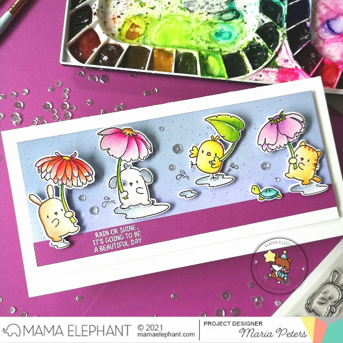 Flower Shower stamp set is a cute set with our signature Mama Elephant characters all ready for a stroll in the rain with their cute flower umbrellas!