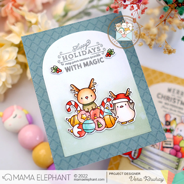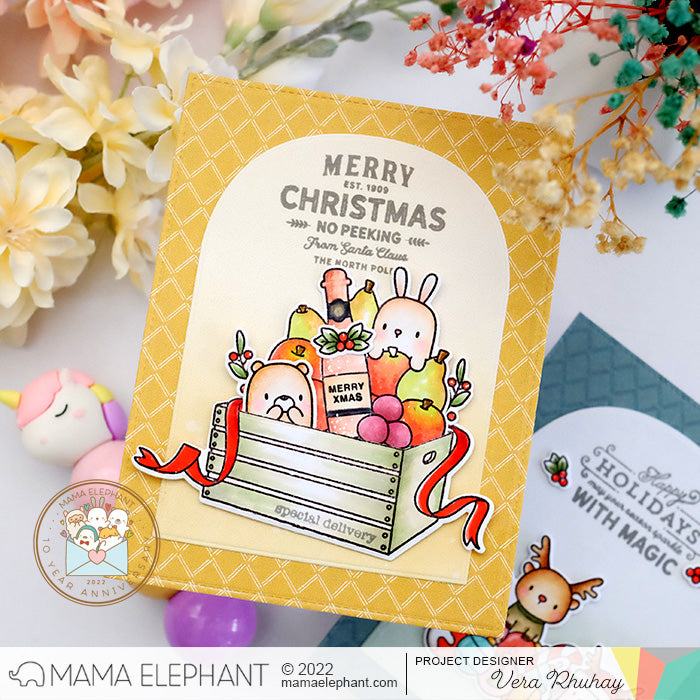 In this Gift Crate set, Mama Elephant friends are surrounded with sweet gift bundles. Stamp them alone or slip them into a wooden gift crate, made possible with the coordinating creative cuts (sold separately).