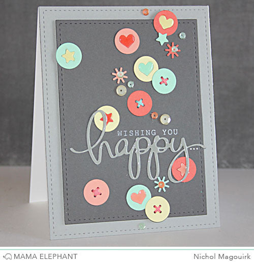 The Happy Everything stamp set contains a lot of Happy. Mix and match words with the word "happy" to make numerous sentiment combinations. This set also has a matching happy script creative cuts.