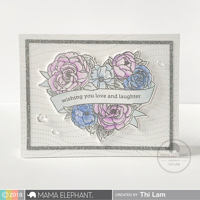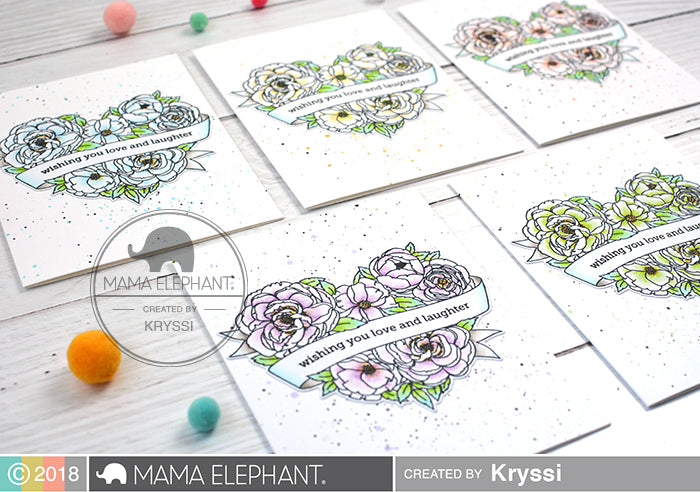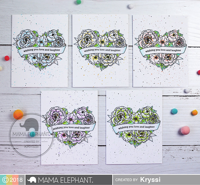 Heart in Bloom is a set illustrated by Anna Oszvald. The main feature in this set is a beautiful arrangement of florals with a beautiful ribbon that runs across which you can customize with sentiments.