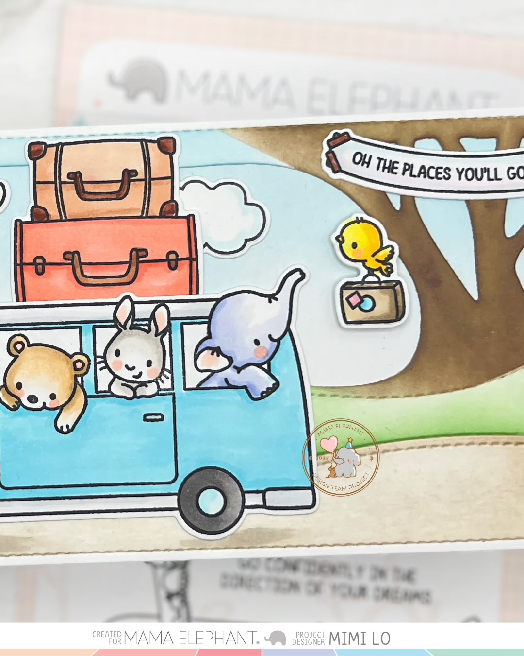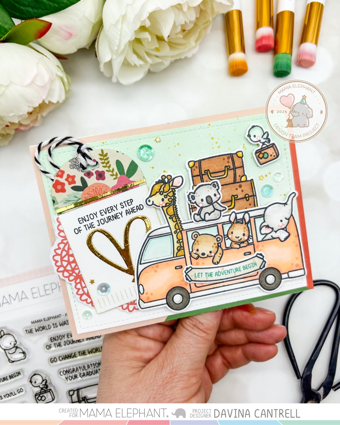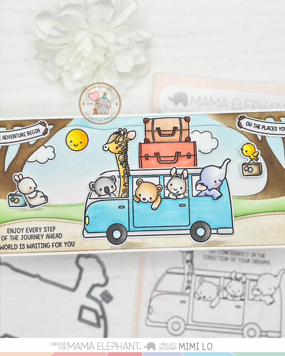 Journey Ahead Clear Stamp Set is illustrated by Aida Zamora and it features a group of cute critters riding in a cheerful mini bus, ready for their next adventure. The set includes a banner they can hold, perfect for adding encouraging sentiments like “Oh the places you’ll go.” Ideal for graduation, farewell, or just-because cards that celebrate life’s journeys!