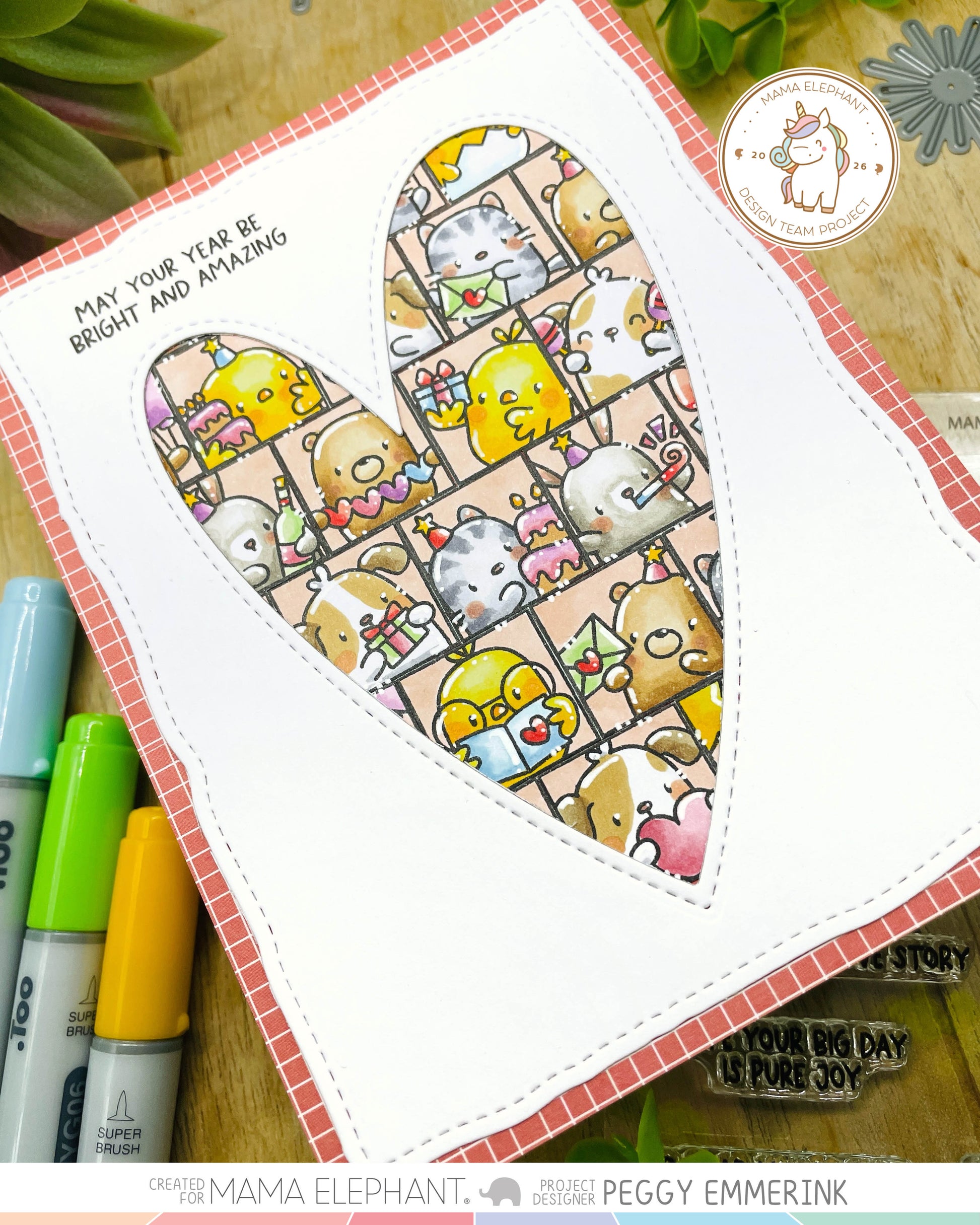 Lil Birthday Docket clear stamp set showcases Mama Elephant friends in adorable square tile shapes, holding balloons, cake, and presents—perfect for fun and festive birthday creations. These stamps will work perfectly with our Docket Collection of Creative Cuts!