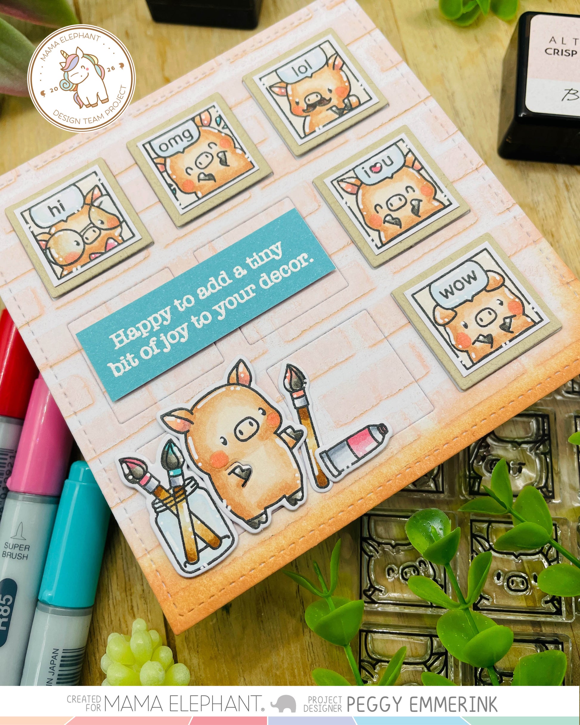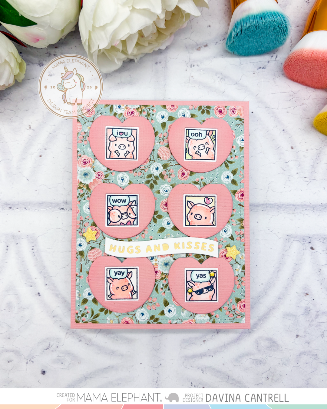 Lil Piggie Docket clear stamp set features adorable little piggies captured in neat square frames, each one expressing a different emotion. The stamp includes an open speech-bubble space, perfect for adding your own stamped or hand written words like “wow,” “ohh,” or any sentiment you choose. So delighted to be growing the Lil Docket Collection with these little piggies!