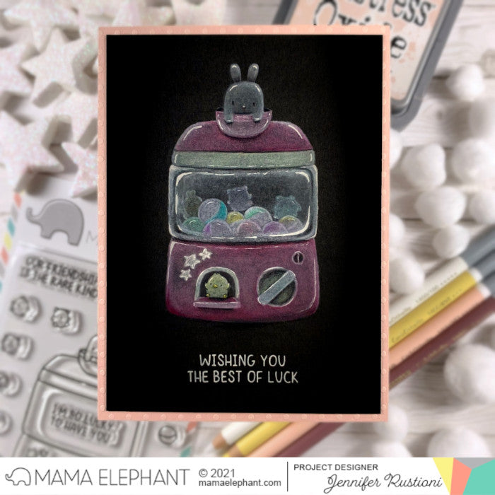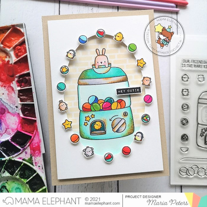 Lil Toy Machine stamp set was inspired by the Gashapon Capsule vending machines in Japan. This set includes tiny animal stamps, capsules and a little toy vending machine. The coordinating creative cuts (sold separately) cuts a little window for capsule placement for an additional fun factor!