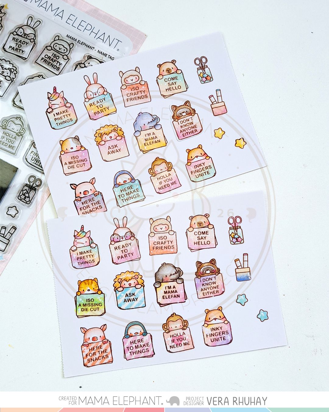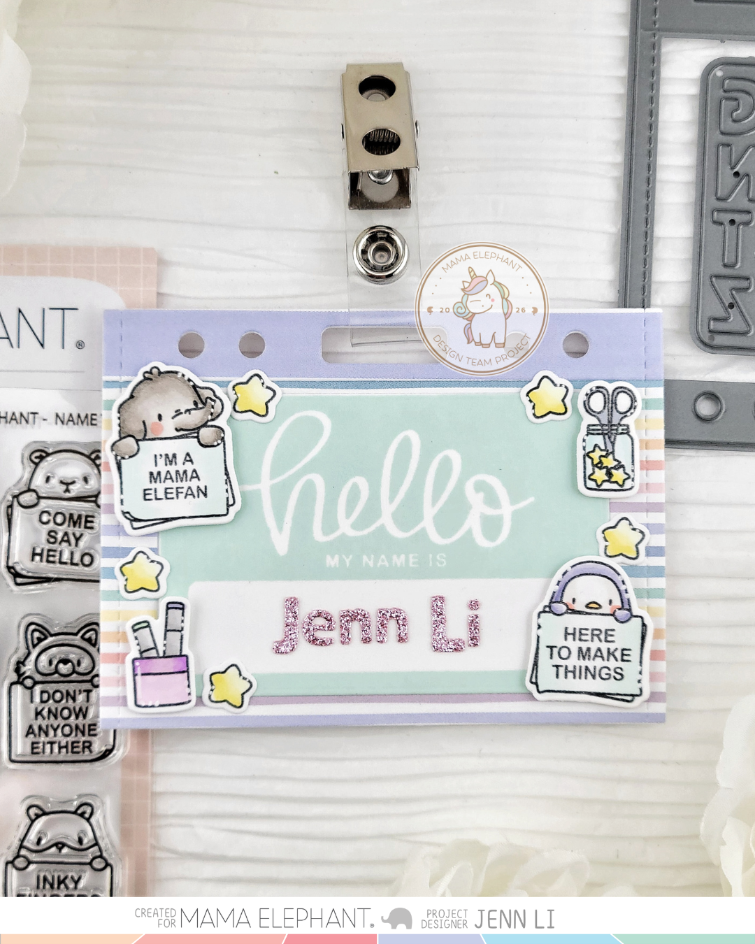 Introduce yourself in the most adorable way with the new Name Tag clear stamp set — a fun and quirky collection perfect for crafters. The centerpiece of this set is a classic "Hello My Name Is" name tag stamp, ready to be inked up in any color you choose for customization. But the fun doesn't stop there! This charming set also includes a series of Mama Elephant friends, each holding up their own little signs with the most relatable sentiments around — "ISO Crafty Friends" and "Inky Fingers Unite."