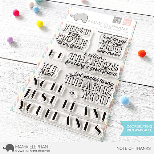 Note of Thanks is a sentiment stamp set. There are never too many ways to say Thank You! In this set, we included color blocks to stamp and fill with your favorite colors or color in with your favorite coloring medium!