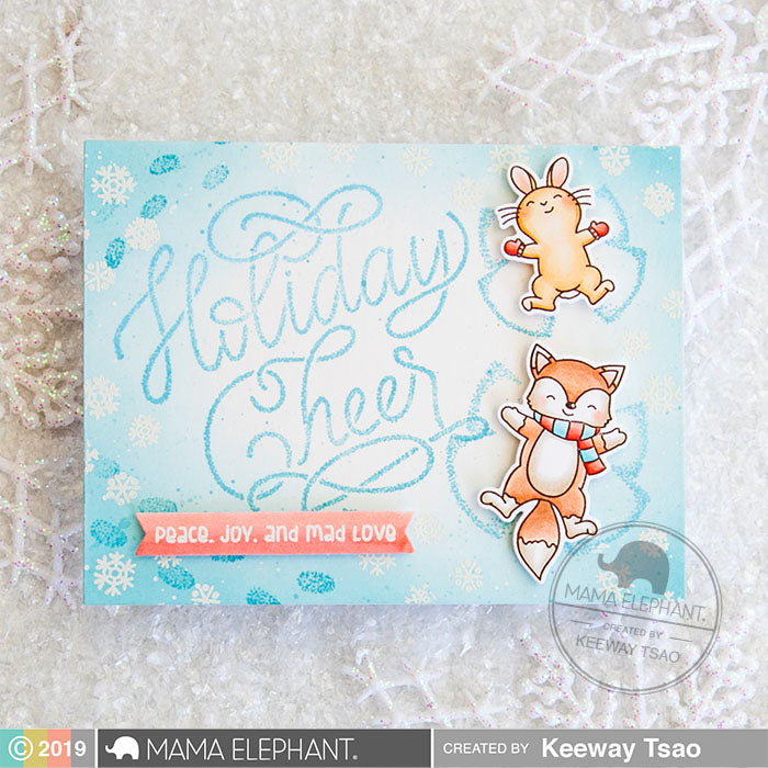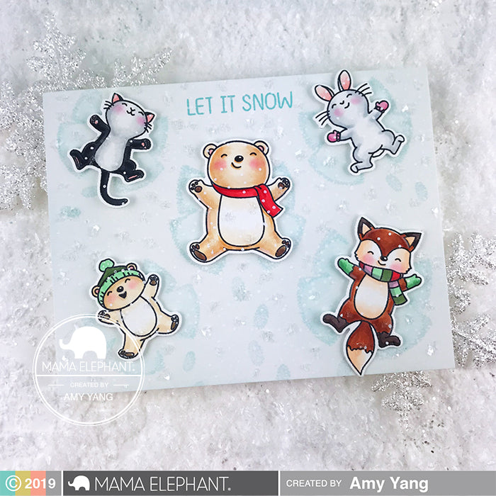 Snow Angels today illustrated by the talented Aida Zamora! This is a super cute set of animals making snow angels in the snow! They are so wonderfully whimsical! We love the overhead point of view! Dress up the "snow" part with some chunky glitter to make it look like snow and add dimension!