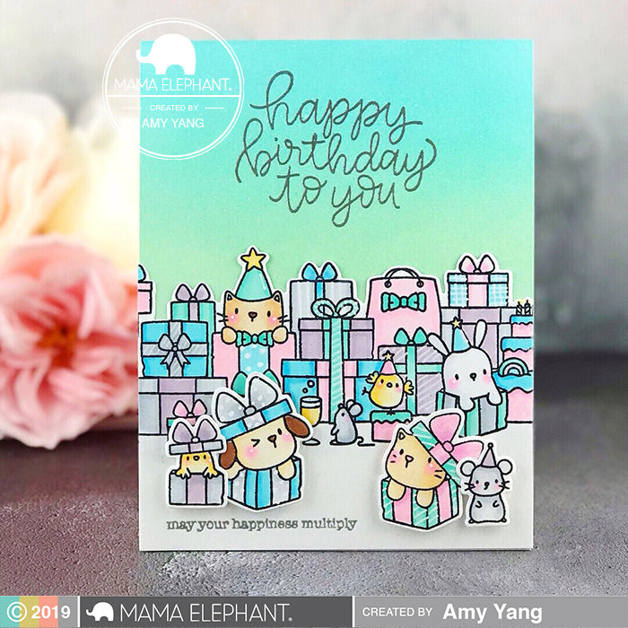 The Birthday Bash clear stamp set is a fun border type stamp set that will make it quick and easy to create fun birthday cards. If you are a fan of The Bunny's Hop, The Cat's Meow and The Dog's Woof, then this is right up your alley. Designed with our favorite Mama Elephant characters, this is a must have for all ME fans!