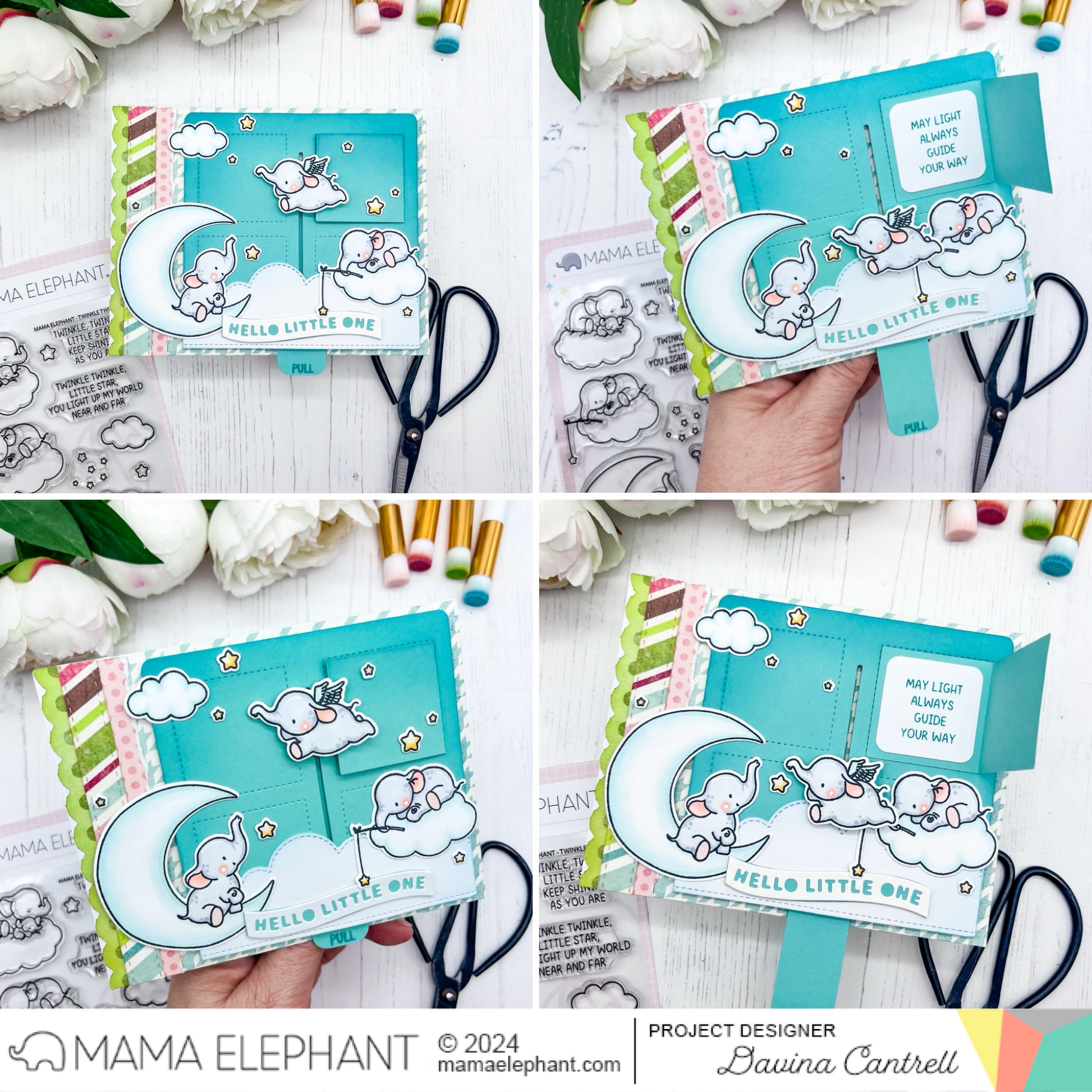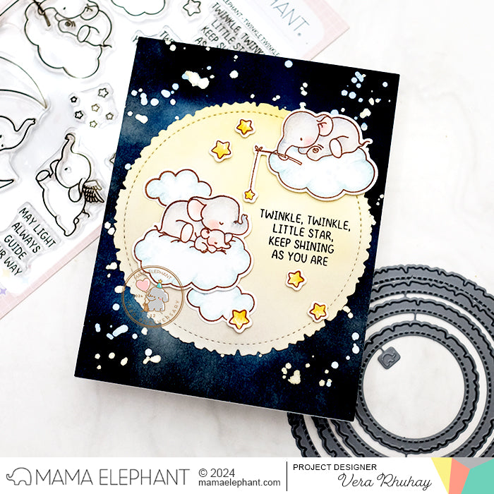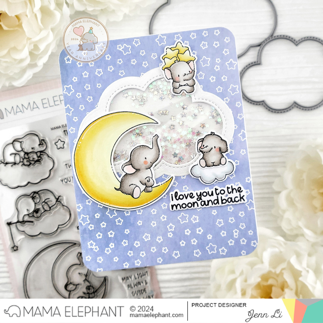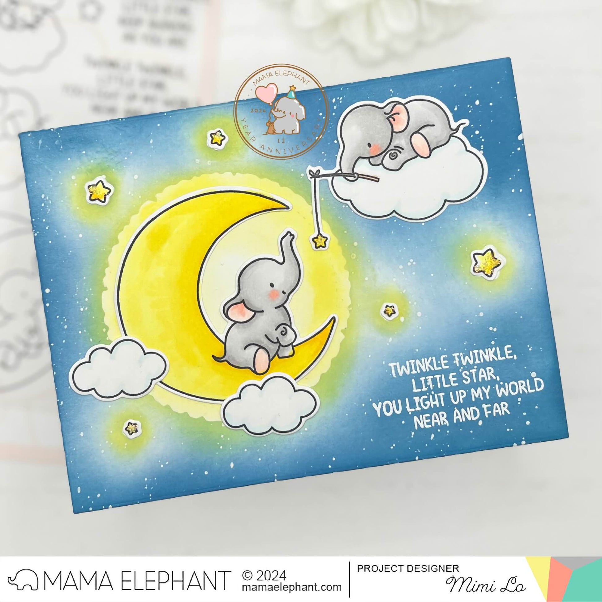 Twinkle Twinkle clear stamp set is illustrated by Aida Zamora. This adorable clear stamp set by Aida showcases her sweet elephants nestled on the moon and soft clouds, bringing a dreamy and serene vibe to any project. Perfect for celebrating little ones, creating whimsical scenes, or adding a touch of charm to your crafting, these illustrations capture a sense of peaceful wonder.
