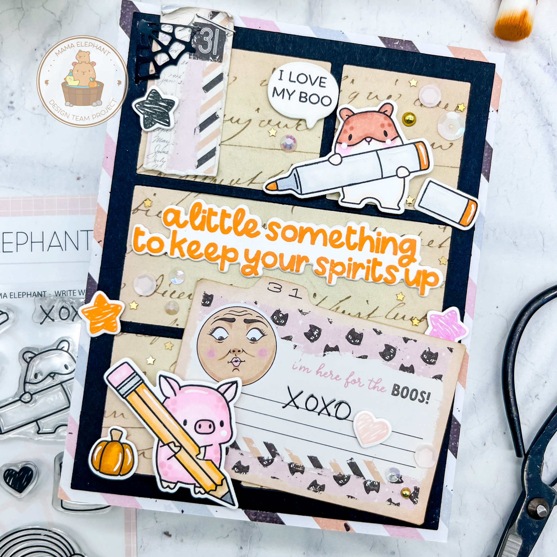 Write With Me clear stamp set features Mama Elephant friends holding writing something to write with! From pencils to paintbrushes and I also had to include a Copic marker! Let these cuties help you with a thoughtful note or even a special drawing! So many ways to give it a personal touch with your projects with this set!